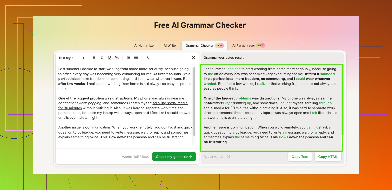 - Good for catching small grammar slips and AI sounding phrases at the same time.